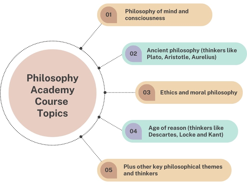 Our courses cover a range of topics, including the philosophy of mind, ancient wisdom, ethics, and the Age of Enlightenment. Each course is crafted to inspire curiosity and deepen understanding. Here are some of the courses in the Philosophy Academy series:
